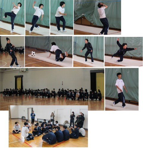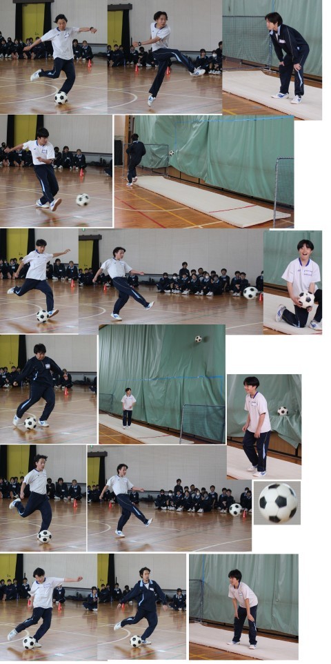 グランドが使えないため、体育館で簡易のゴールを設定して行いました。