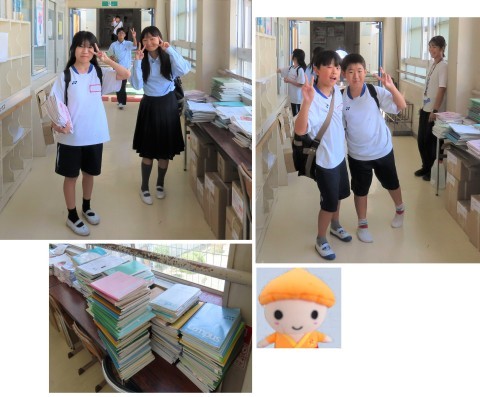 3時間のテストが終わり、各教科の係が 職員室前に提出物のノートやワークブックを運んでくれています。