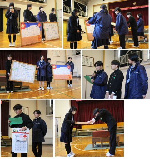 その後、1・2年生からは心のこもったメッセージボードを、3年生からは手作りのカレンダーが贈られました。