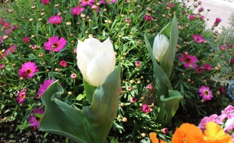 「赤・白・黄色♪」と歌のごとく、色とりどりのチューリップやパンジー・ビオラ・マーガレットが咲き誇っています。