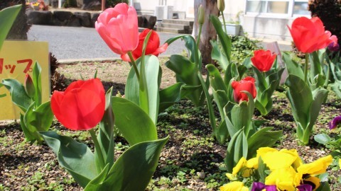 12月に🌷球根を植え、“学校きれいボランティア”のみなさんが、毎日せっせと水をやり、雑草を抜き、肥料を与えて育ててくれました。