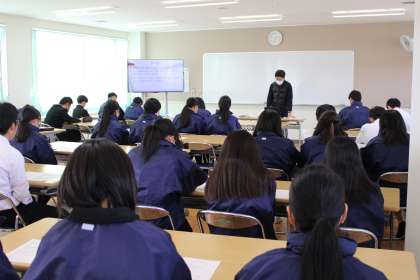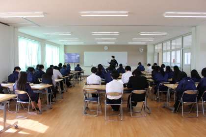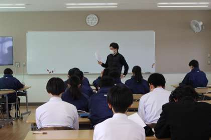 5時間め、多目的室に集合し、明日の事前指導を行いました。進路指導主事の黒田先生から、注意事項等が書かれたプリントが配布され、3年生は緊張した面持ちで話を聞いていました。