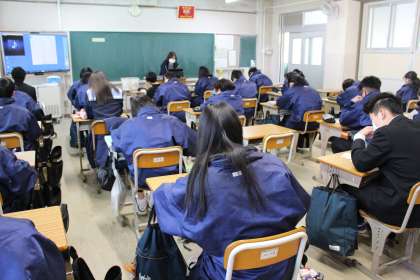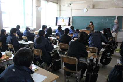 ・2組「国語」『走れメロス』俳優さんの音読を聴いています。ティームティーチングの授業です。