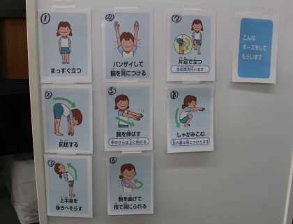 1人ずつ、つい立ての向こうで画像2のようなポーズをして、理学療法士さんに診ていただきます。