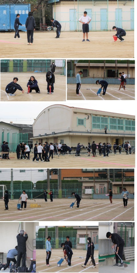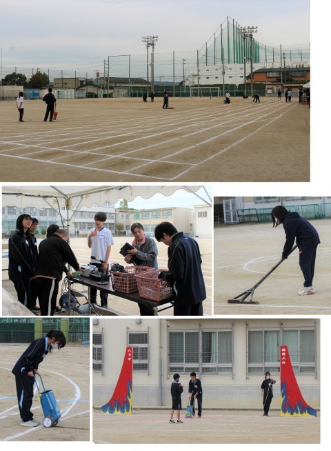 各部活動や生徒会・各委員のみなさんが、協力してグランドのライン引き・そうじ・テント設営・放送設備設営等をしてくれました。