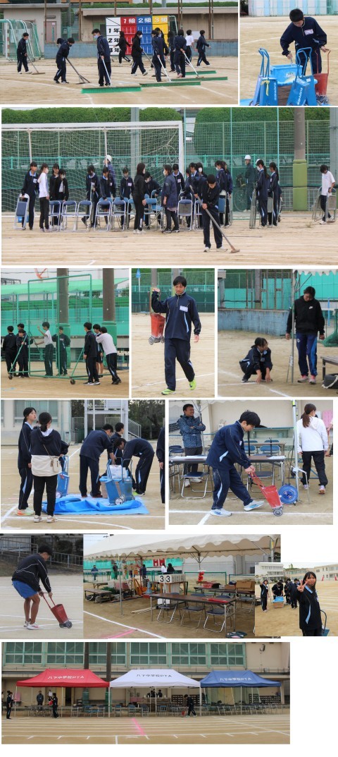 各部活動や生徒会・各委員のみなさんが、協力してグランドのライン引き・そうじ・テント設営・放送設備設営等をしてくれました。
