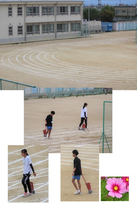 10月3日(金)、体育科の先生が早く出勤して、グランドにラインを引いています。