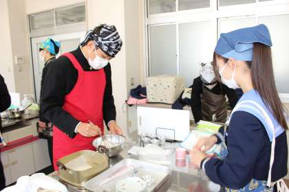生地をカップに入れている間に、他の人は調理器具を洗い始めます。とても段取りよく実習ができています。
