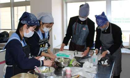 1組は3時間めに実習を行いました。説明を聞いて、よく手を洗い、さあ調理が始まりました。