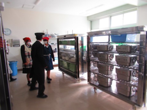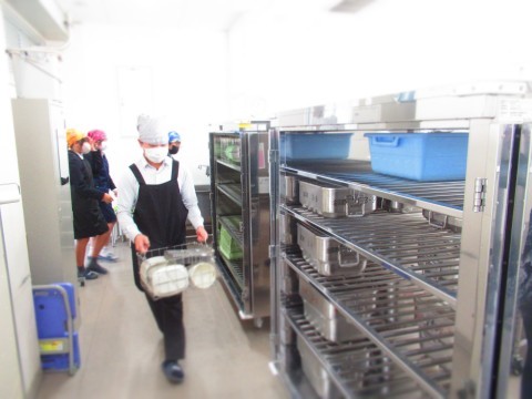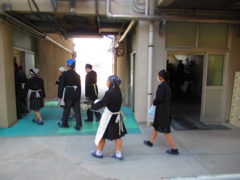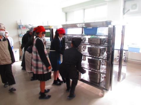 喫食中のようす、食缶を運ぶようすを紹介。