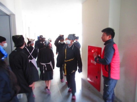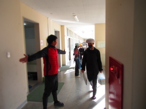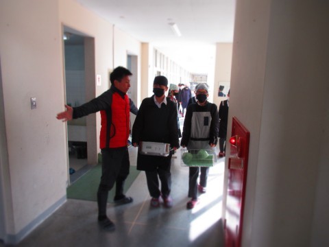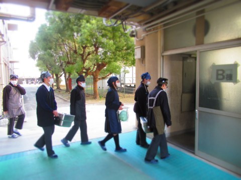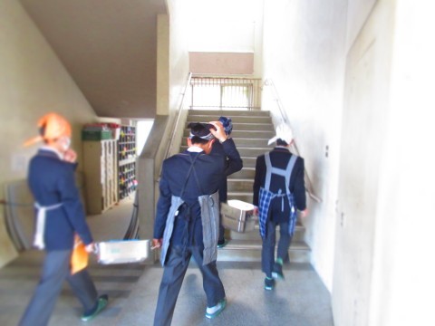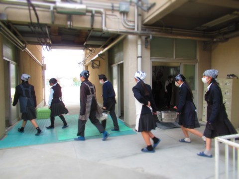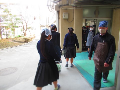 2年生の給食当番が通る際、教員が体を張り、生徒の安全確保に努めています。