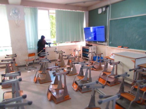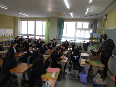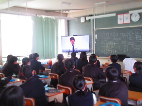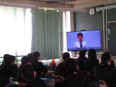 表彰伝達の動画を観る3年生。