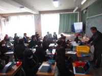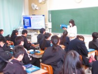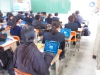 始業式、認証式を教室で見る生徒。