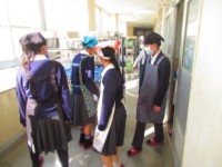食器・食缶・牛乳を運ぶ給食当番の生徒。