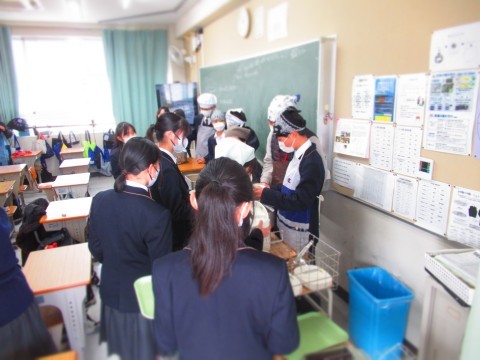 給食を運ぶ生徒、廊下で見守る学年主任、盛り付けをする担任の先生と給食当番、喫食中のようすを紹介します。