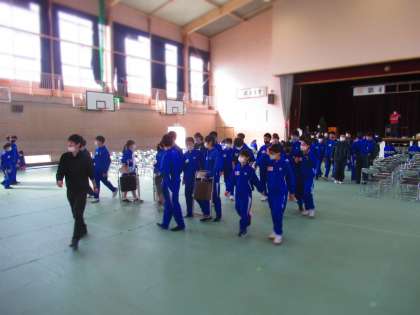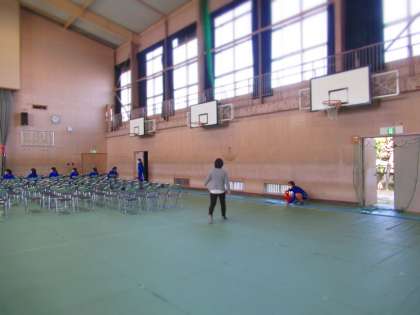 入学式準備のようすを紹介しています。 写真は,入学式本番の舞台である体育館の設営風景です。