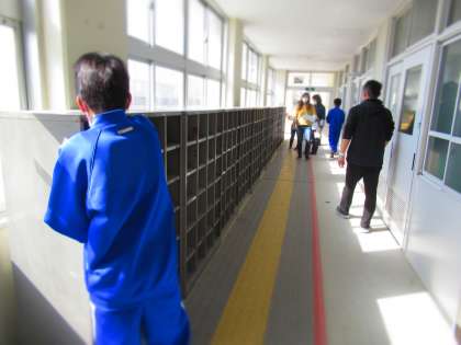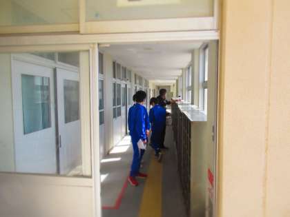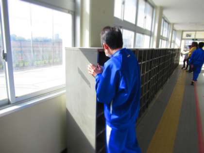 新入生が使う下駄箱を一つひとつ丁寧に拭く男子バスケットボール部の部員。