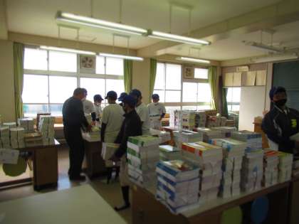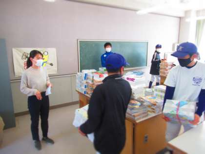 教科書を運ぶ野球部員。 額に汗を流しながら仕事に勤しんでくれました。