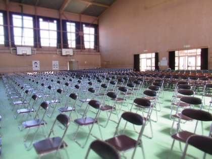 午前8時30分から始めた準備は,体育館の設営(シート敷き,椅子並べ),周辺の掃除,1年生校舎の整備,教科書運びなど,様々な役割ごとに分かれ2時間もかからないほどで終了しました。