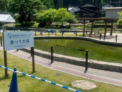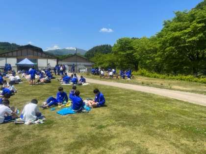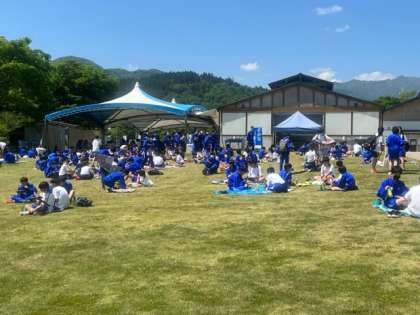 あゆパークで昼食です。各自お弁当を食べています。なお、お弁当には鮎は入っていませんでした。