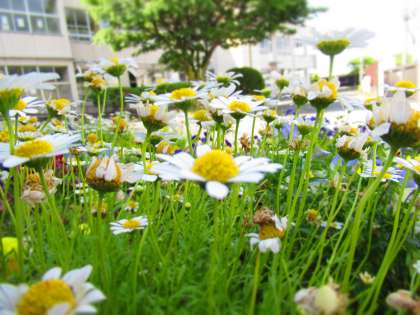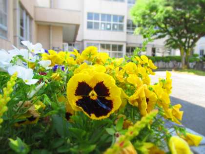 正門入ってすぐの花壇には,色とりどりの花が咲き誇っています。