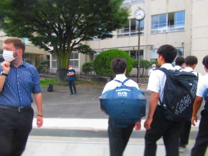 NSのマーク先生は毎朝,正門に立ち子どもたちとコミュニケーションを図っています。