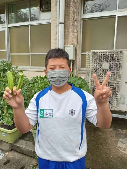 校舎に囲まれていので、日当たりがあまりよくなく、実よりも葉が大きく育ち、収穫できるか不安でしたが、本日念願の初収穫でした。
