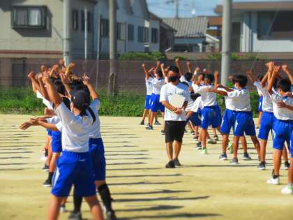 全体練習の前には,ラジオ体操で体をほぐしました。
