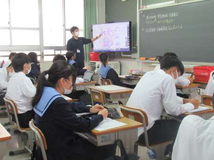 写真上:社会(工業地帯) 写真中:数学(多角形の内角の和) 写真下:家庭科(行事食のまとめ)