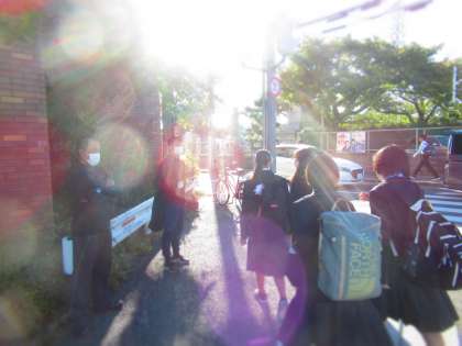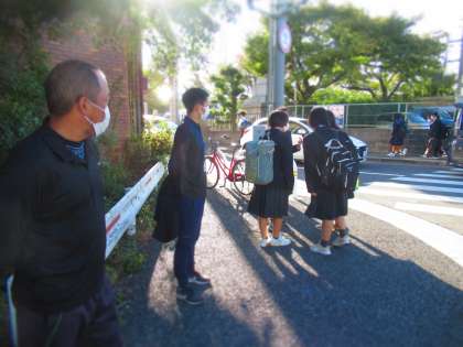 全職員が校区内各所に立ち,生徒の登校を見守りました。