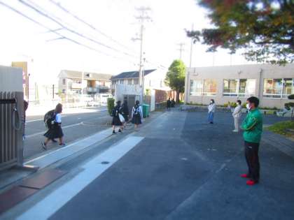 正門でも,学年主任や養護教諭の先生方が登校を見守りました。