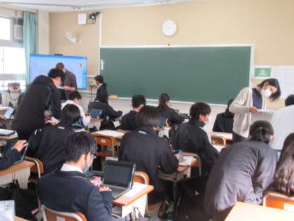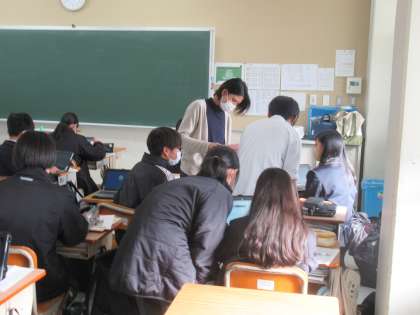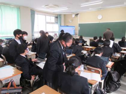 自分たちの知っている人について,文を作成し,互いにスピーチをしています。
