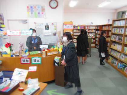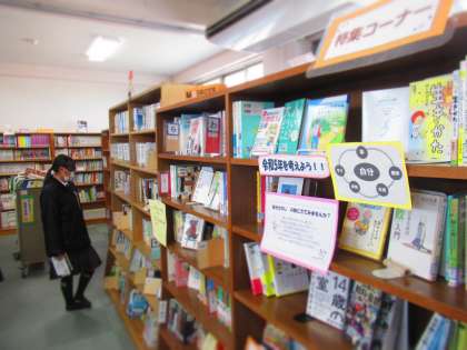 本校図書室には,生徒にとって魅力的な本がたくさんありあります。 めあての本を探しに,図書室を訪れています。