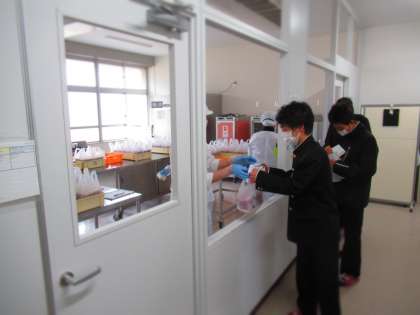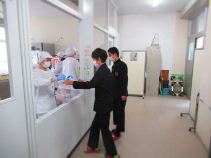 給食を取りに配膳室へ行く生徒。 「ありがとうございます!」と言って、給食をもらっています。