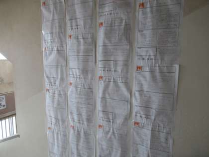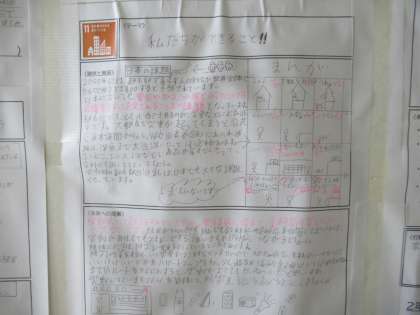 「住み続けられるまちづくりを」についてまとめ,学年の階段に掲示しています。
