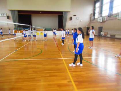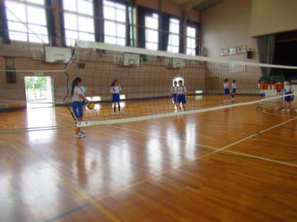 水泳授業がない日は、体育館でバレーボールの学習に取り組む3年生。