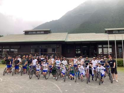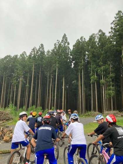 マウンテンバイクの体験。 コースに出る前に集合写真。