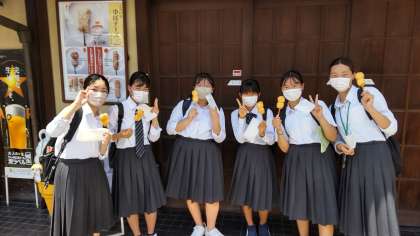 子ども達に会うのは困難かと思っていましたが‥ 発見しました! ゆばチーズ揚げを手に “はい チーズ!”