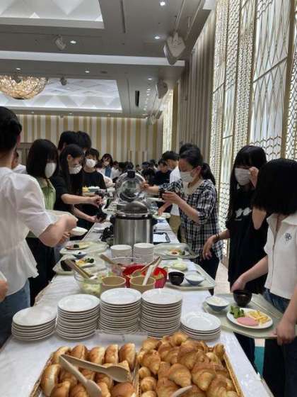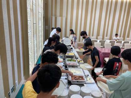 バイキングで料理をとる生徒、何を食べようか迷う生徒。