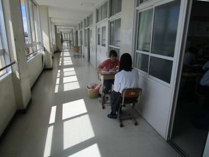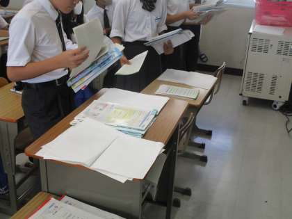 教室で順番を待っている人は宿題を提出したり、2学期に向けての決意を書き込んでいます。