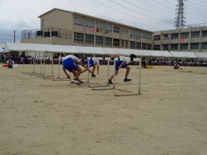 50m障害物競走は、スタートしてからすぐに網をくぐり、ハードルの中を通り、麻袋でぴょんぴょん跳ねてゴールをめざします。