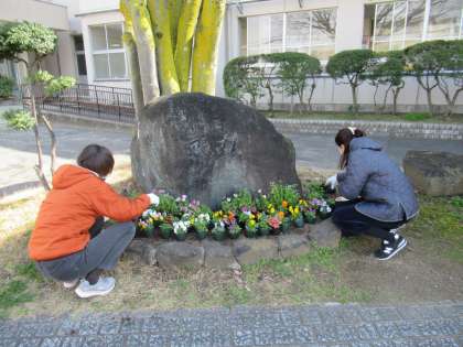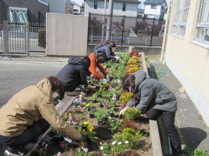 本日、PTA花の植え替えを行い、正門すぐの花壇は華やかになりました。
