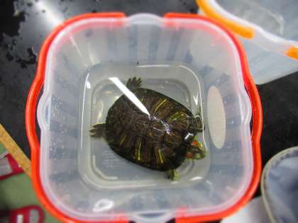 【写真上】 理科部のいきもの係が飼っているカメ。