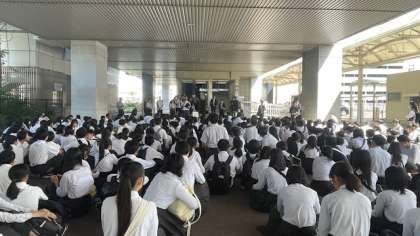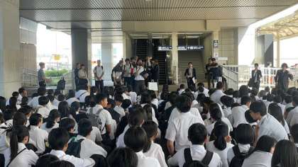 空港に着き、クラスごとに整列しています。