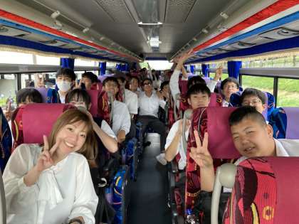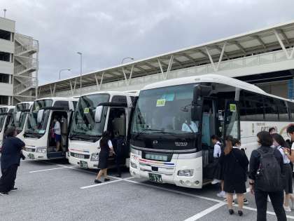 平和祈念資料館へ向けて出発! 天候はくもりですが、沖縄らしく、とても蒸し暑いです!