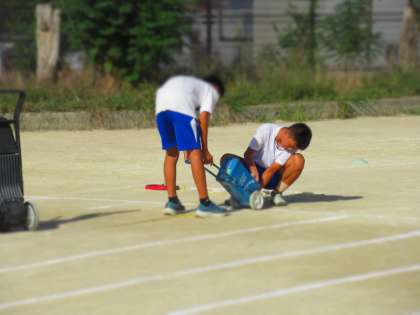 ラインを引く陸上競技部と用具係のサッカー部。