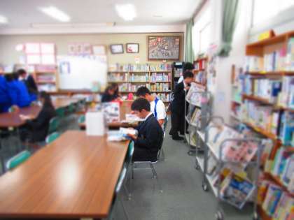 お昼休みの図書室です。 【写真上】大型図書をみんなで! 【写真下】常連組