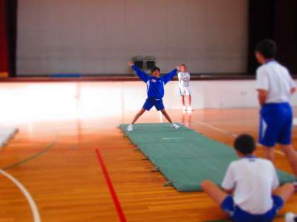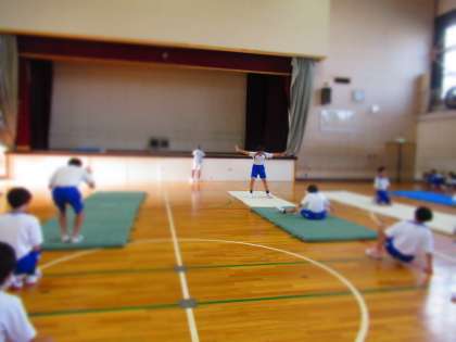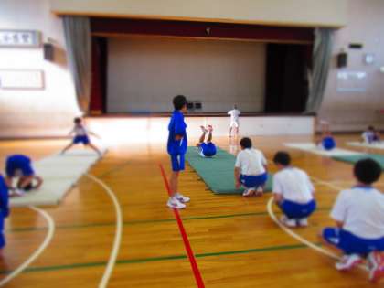 マット運動で、開脚前転、開脚後転に挑んでいます。