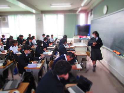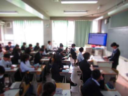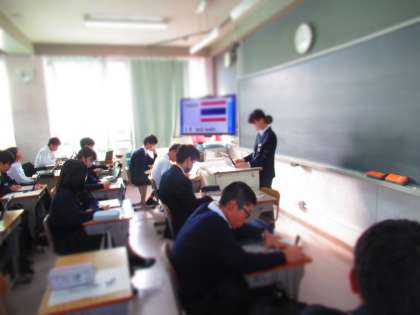 2年生英語科の授業では、各国の特徴について調べたことを発表しています。