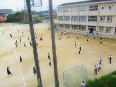 現在、体育館空調設備工事が進められているため、この時間は4つの団体がグラウンド各所で体育の授業を展開していました。